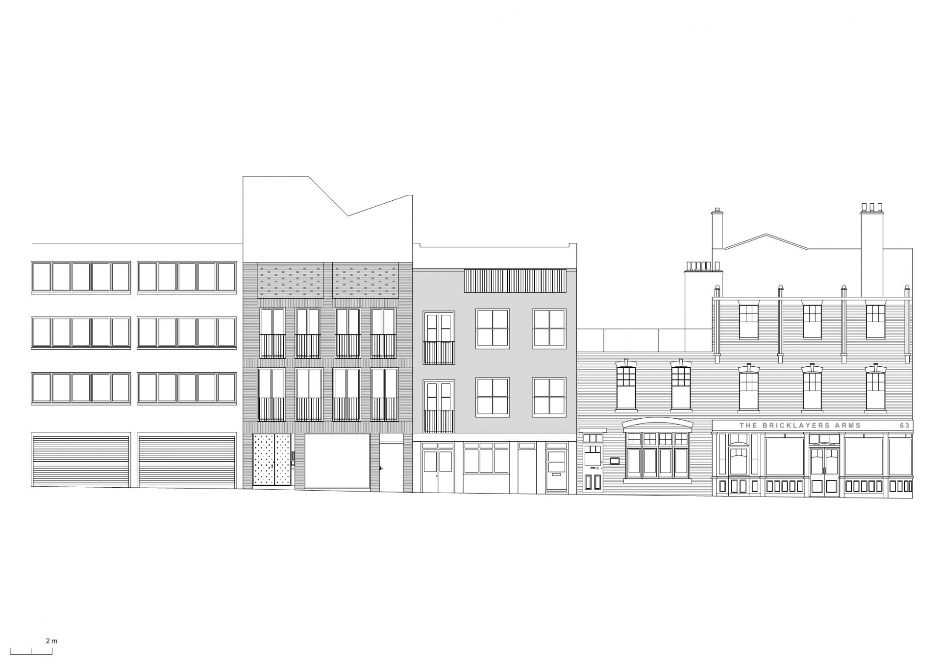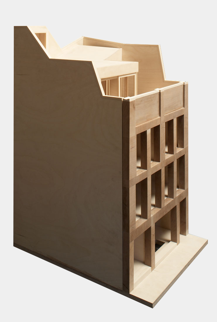 The site of this project was the last remaining piece of Charlotte Road to have escaped redevelopment in the nineteenth century, when most of the existing one-room-deep cottages were replaced with larger scale warehouses and workshops that served the neighbourhood’s burgeoning industrial economy. This gradual intensification established a prevailing urban character of buildings directly abutting their neighbours on three sides, which places a special value on both the front elevation and the roof in their potential for bringing light and air into the site.