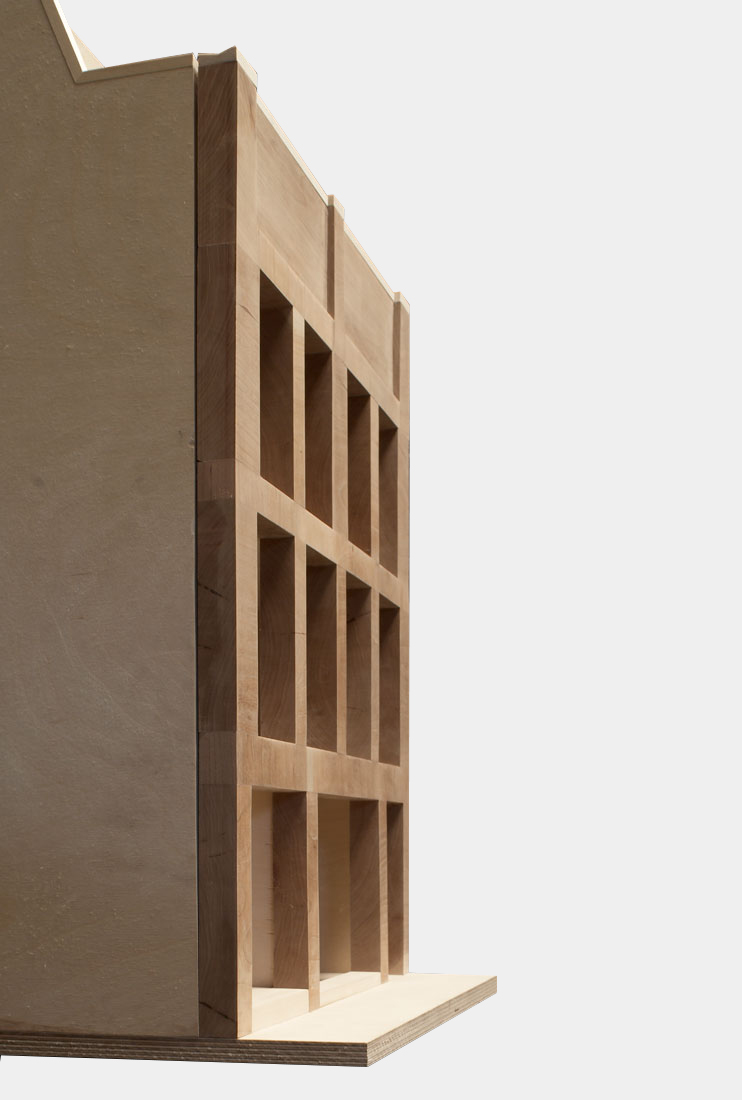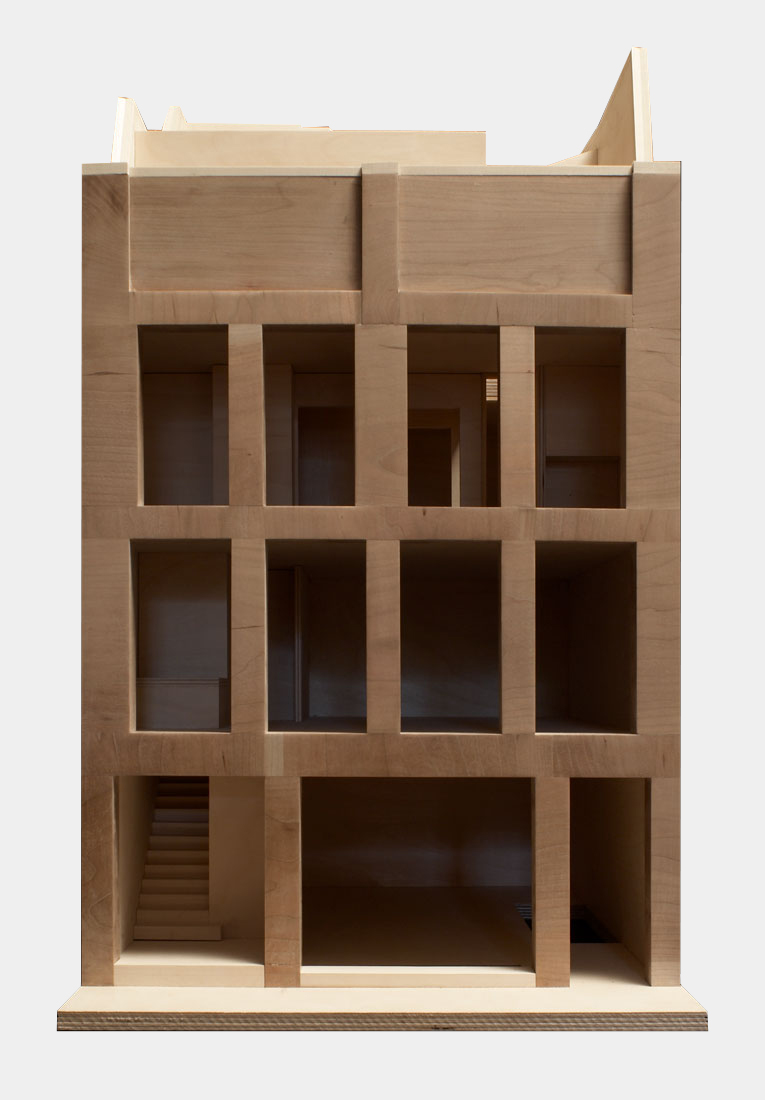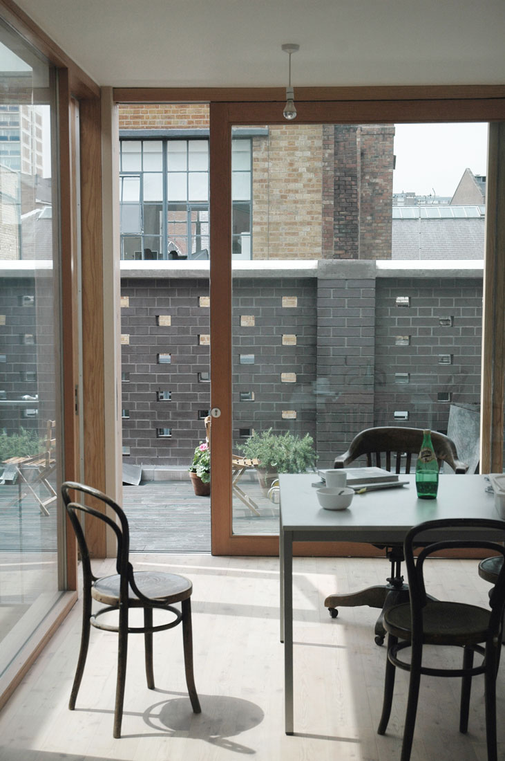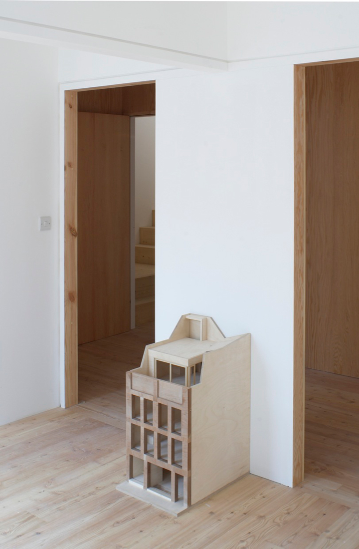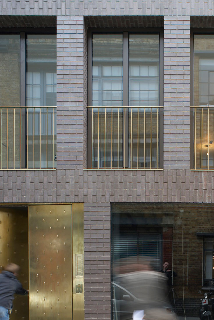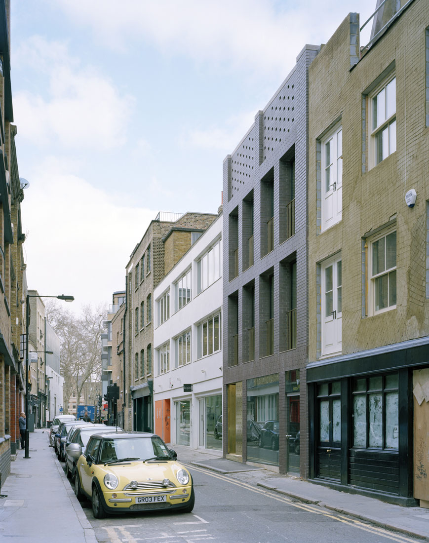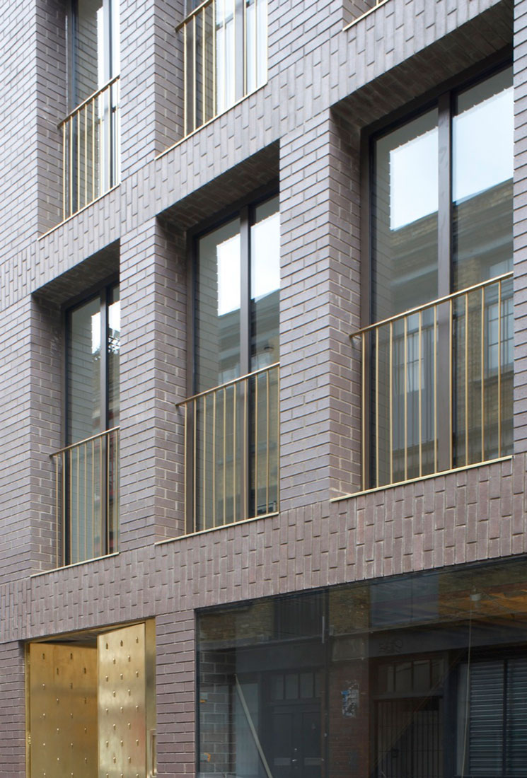 Arranged across five floors, the building supports three distinct units that are unified behind a façade of brick faced concrete columns and lintels. A gallery showroom occupies the ground and basement floors, defined by a large shop window that sits flush with the building face, directly connecting to the public world of the street and contrasting with the deep reveals of the floors above. On the first floor, four equally spaced windows describe a large studio office space, whilst on the second floor two smaller rooms are expressed as two pairs of windows. These rooms form part of a grouping of bedrooms for a maisonette apartment, arranged around a timber lined inner chamber and small courtyard that brings light and air deep into the dwelling. The apartment’s public rooms are on the third floor which steps back from the street behind a perforated brick parapet to create a roof terrace with views over the city.