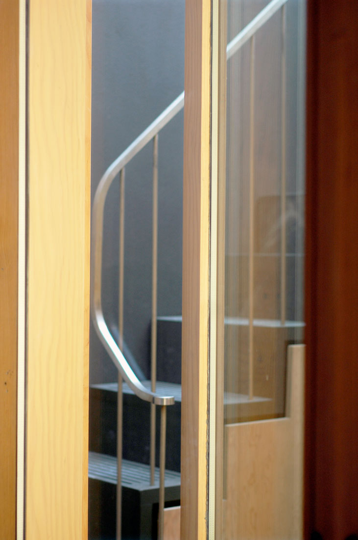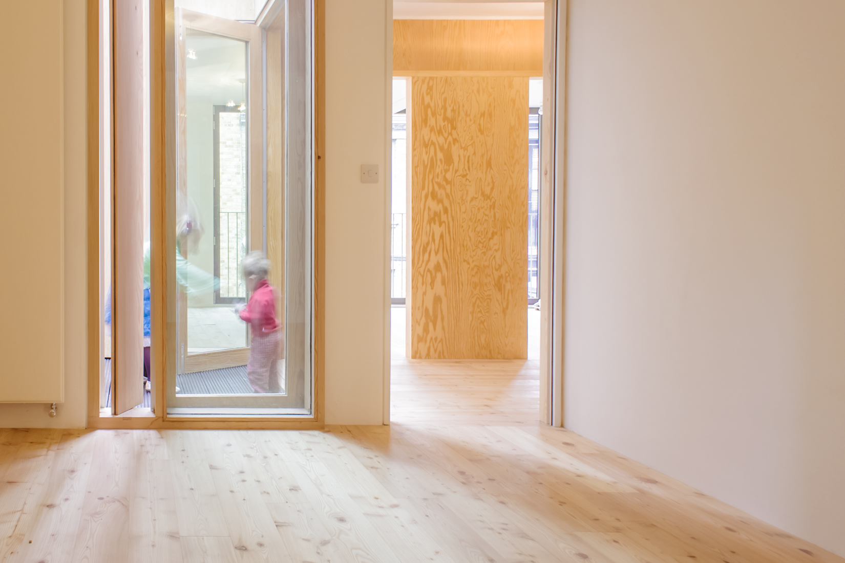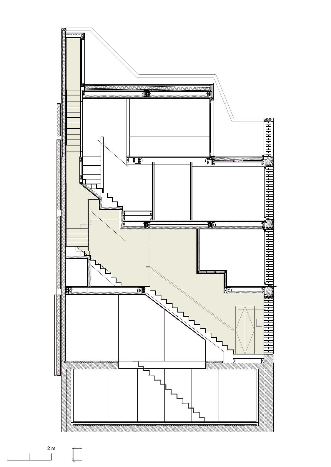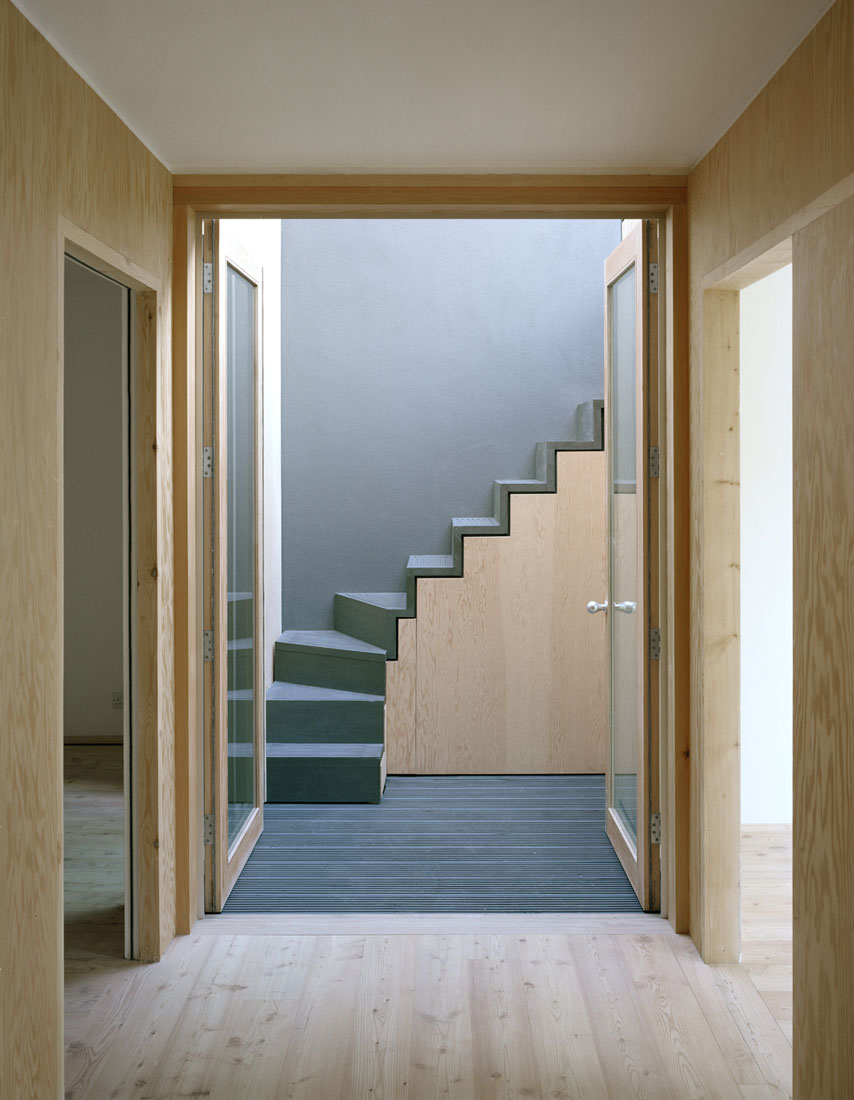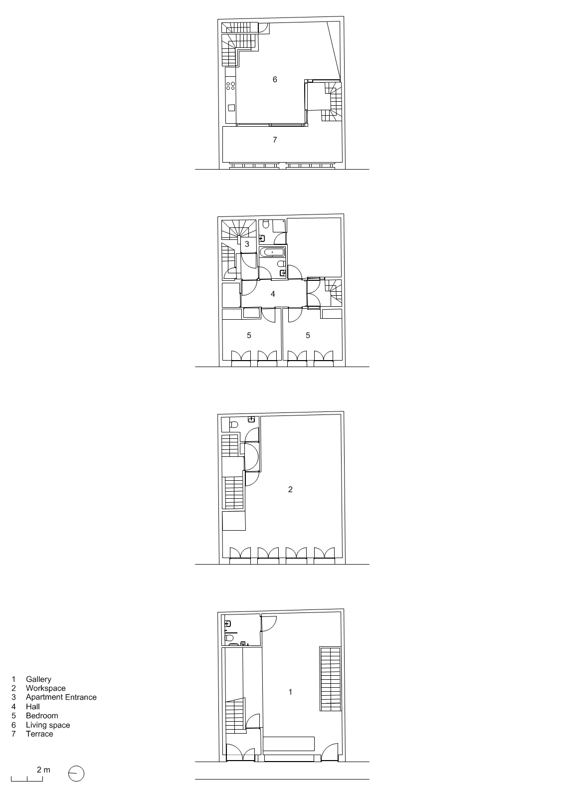 Arranged across five floors, the building supports three distinct units that are unified behind a façade of brick faced concrete columns and lintels. A gallery showroom occupies the ground and basement floors, defined by a large shop window that sits flush with the building face, directly connecting to the public world of the street and contrasting with the deep reveals of the floors above. On the first floor, four equally spaced windows describe a large studio office space, whilst on the second floor two smaller rooms are expressed as two pairs of windows. These rooms form part of a grouping of bedrooms for a maisonette apartment, arranged around a timber lined inner chamber and small courtyard that brings light and air deep into the dwelling. The apartment’s public rooms are on the third floor which steps back from the street behind a perforated brick parapet to create a roof terrace with views over the city.
