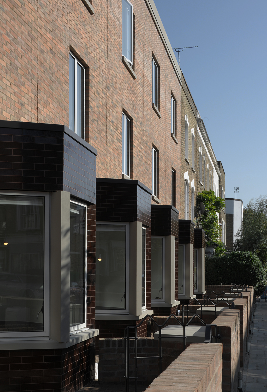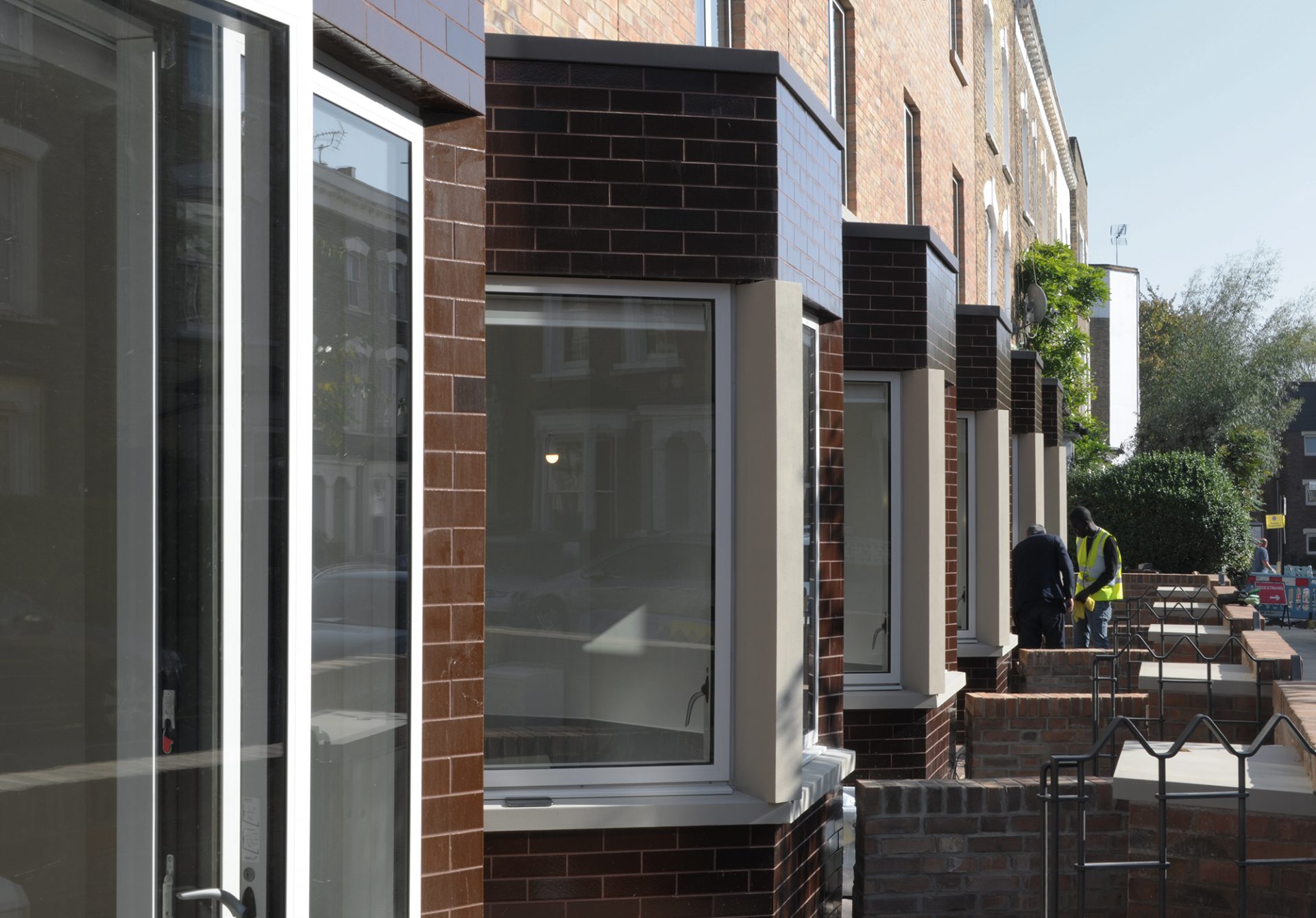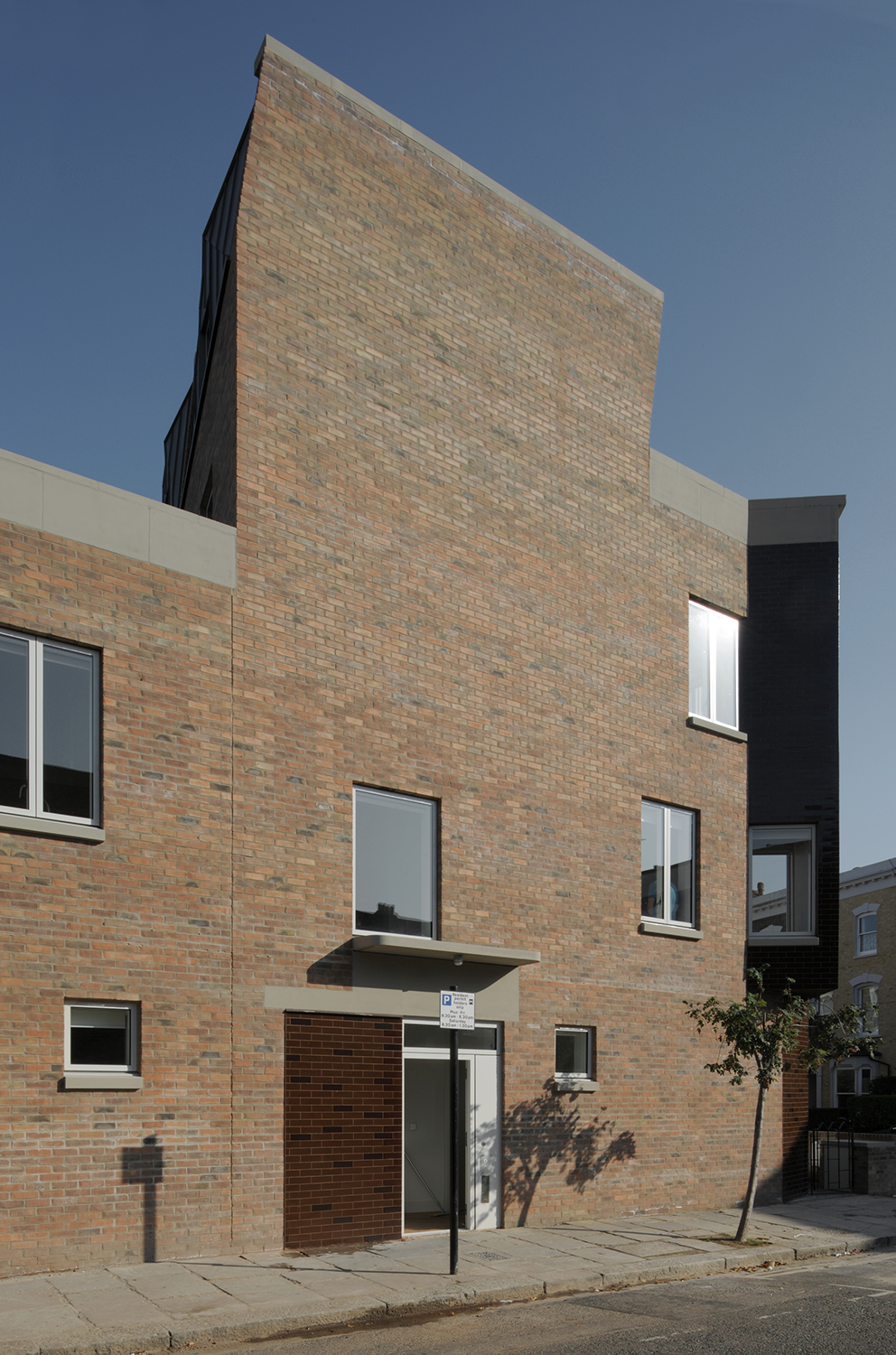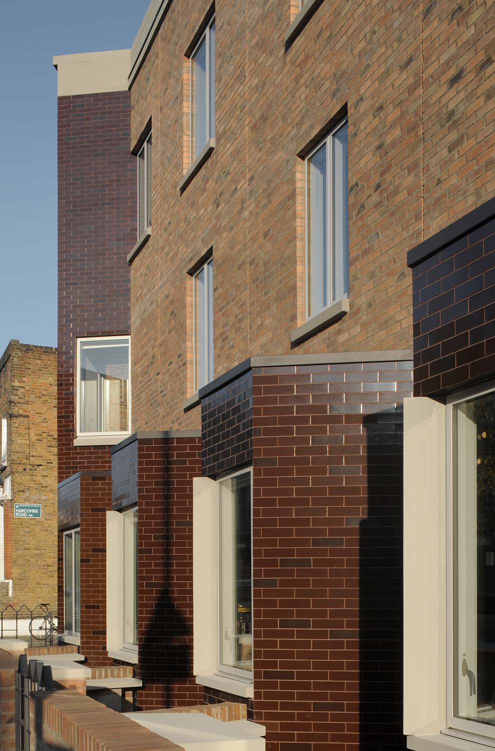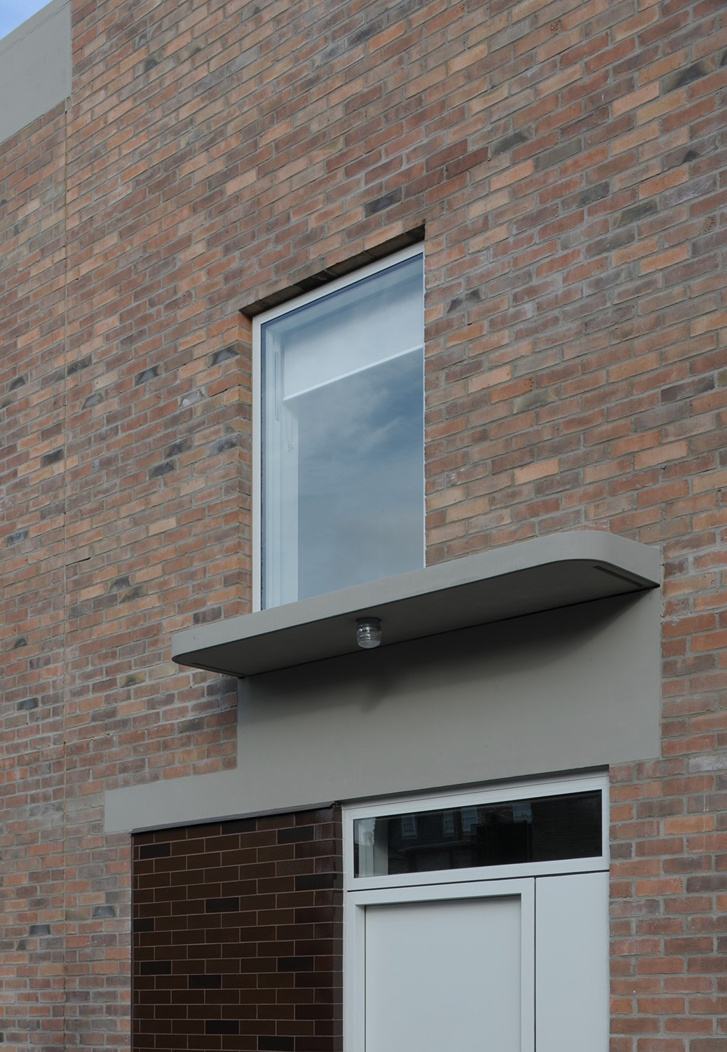 Les détails et la juxtaposition des matériaux contribuent à abstraire l’image de la maison en bande, la baie et le porche acquièrent une nouvelle image inédite par l’emploi une tuile vernissée marron et une brique d’argile rouge. Le choix des matériaux permet d’ intensifier l’expérience d’habitation du seuil. Il s’agit d’un lieu particulier et généreux, à la fois robuste et urbain. L’image du bâtiment est caractérisée par ses relations urbaines. L’avant, le côté et l’arrière ont des rôles et des expressions architecturales différents. Ensemble, ils créent un bâtiment d’une richesse agréable et respectueux de son contexte particulier, tout en ayant un caractère fort qui lui est propre.