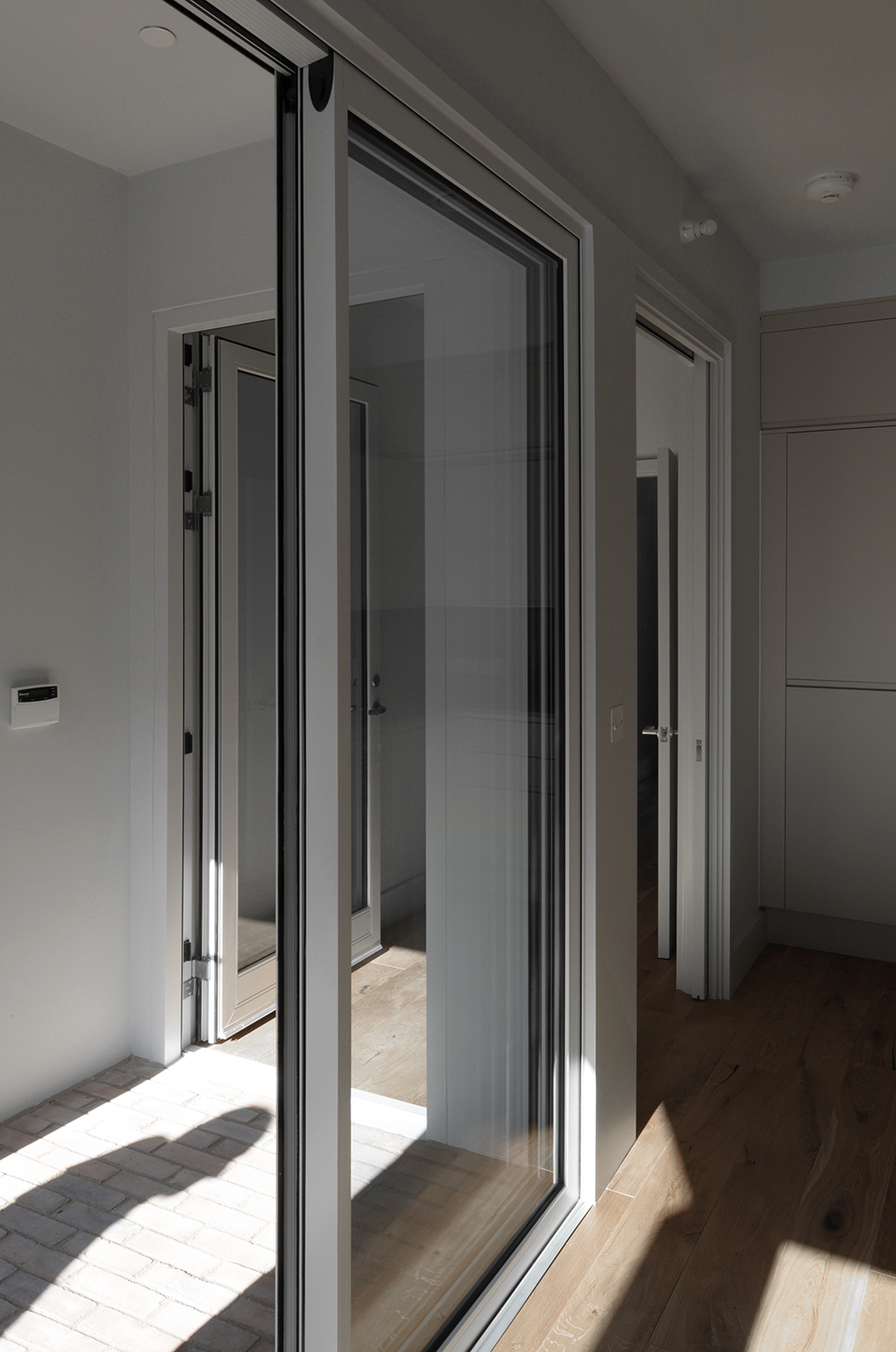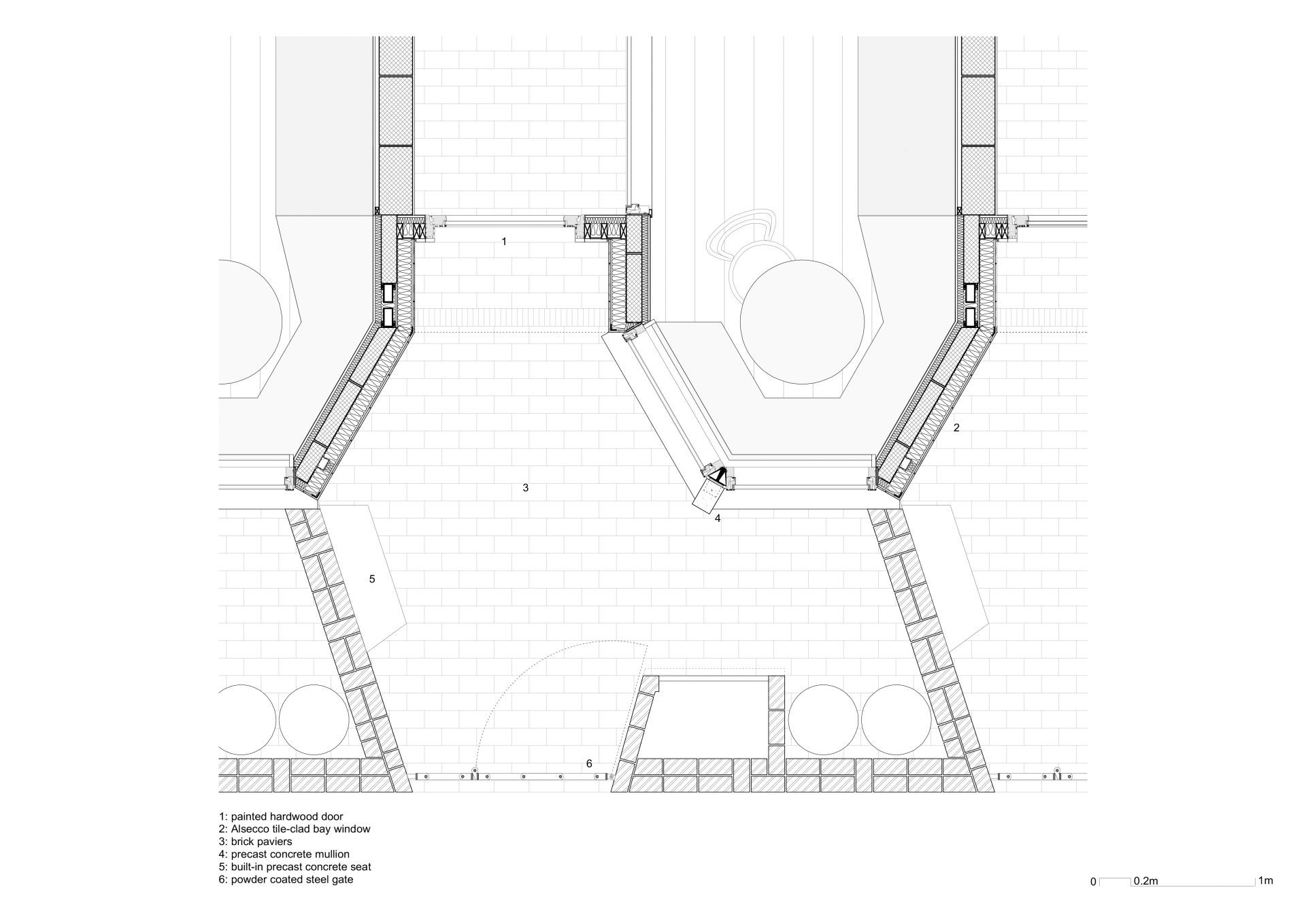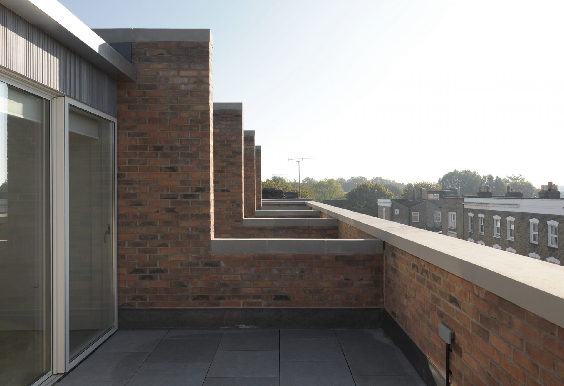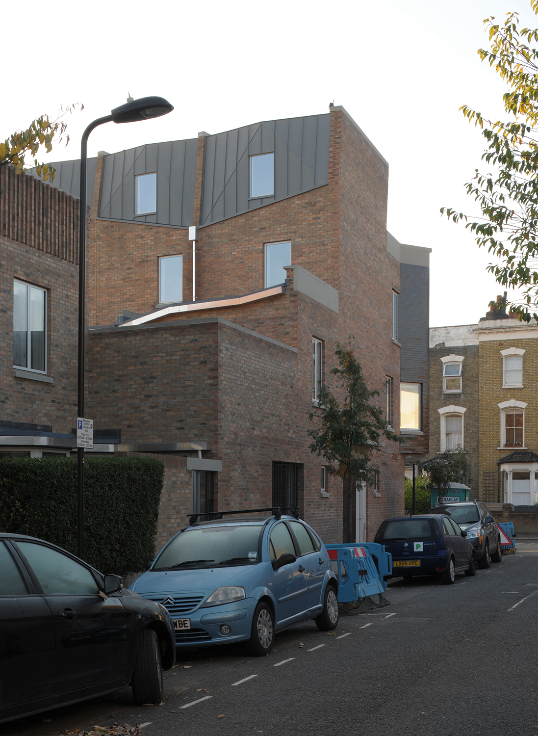 Les détails et la juxtaposition des matériaux contribuent à abstraire l’image de la maison en bande, la baie et le porche acquièrent une nouvelle image inédite par l’emploi une tuile vernissée marron et une brique d’argile rouge. Le choix des matériaux permet d’ intensifier l’expérience d’habitation du seuil. Il s’agit d’un lieu particulier et généreux, à la fois robuste et urbain. L’image du bâtiment est caractérisée par ses relations urbaines. L’avant, le côté et l’arrière ont des rôles et des expressions architecturales différents. Ensemble, ils créent un bâtiment d’une richesse agréable et respectueux de son contexte particulier, tout en ayant un caractère fort qui lui est propre.