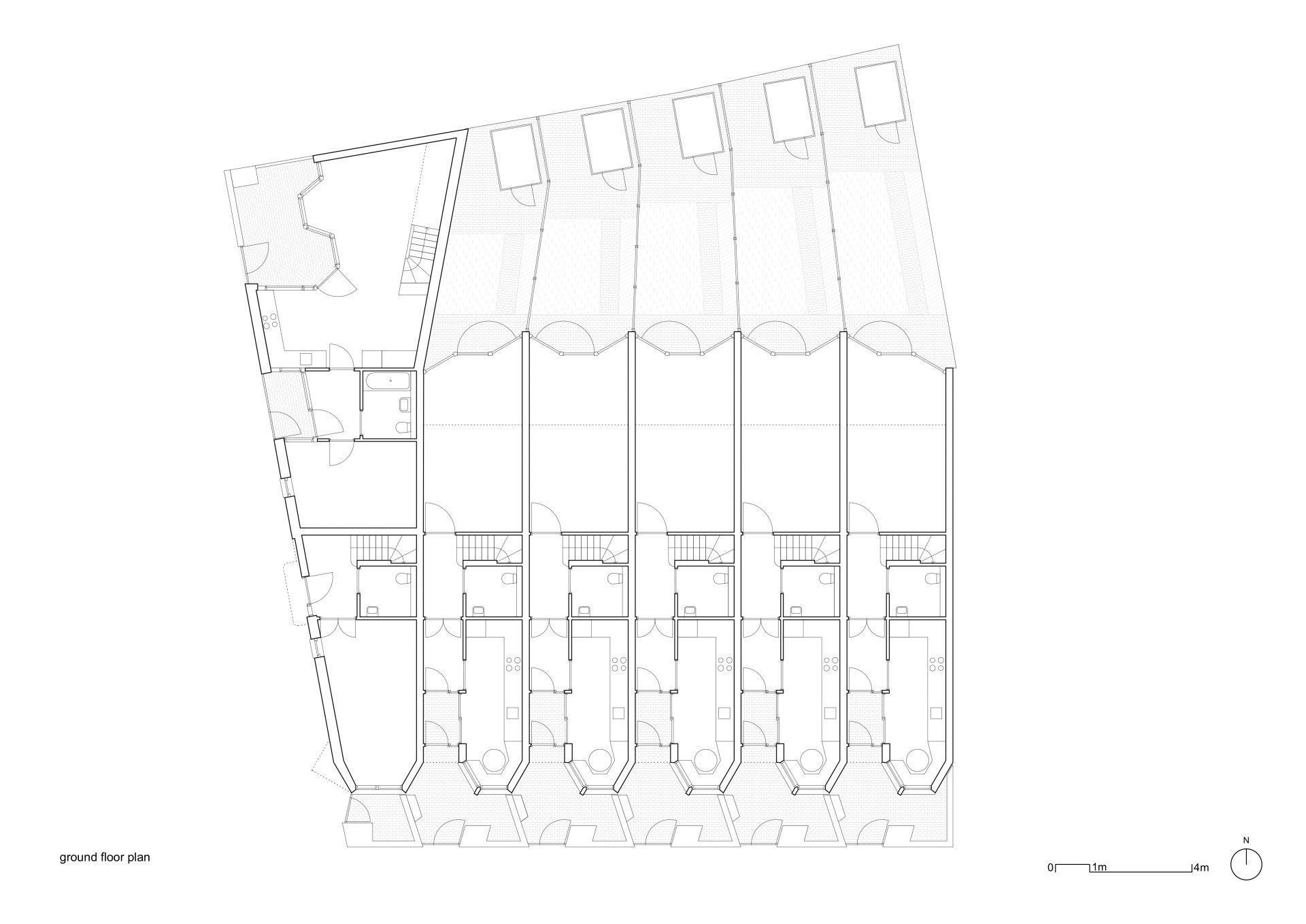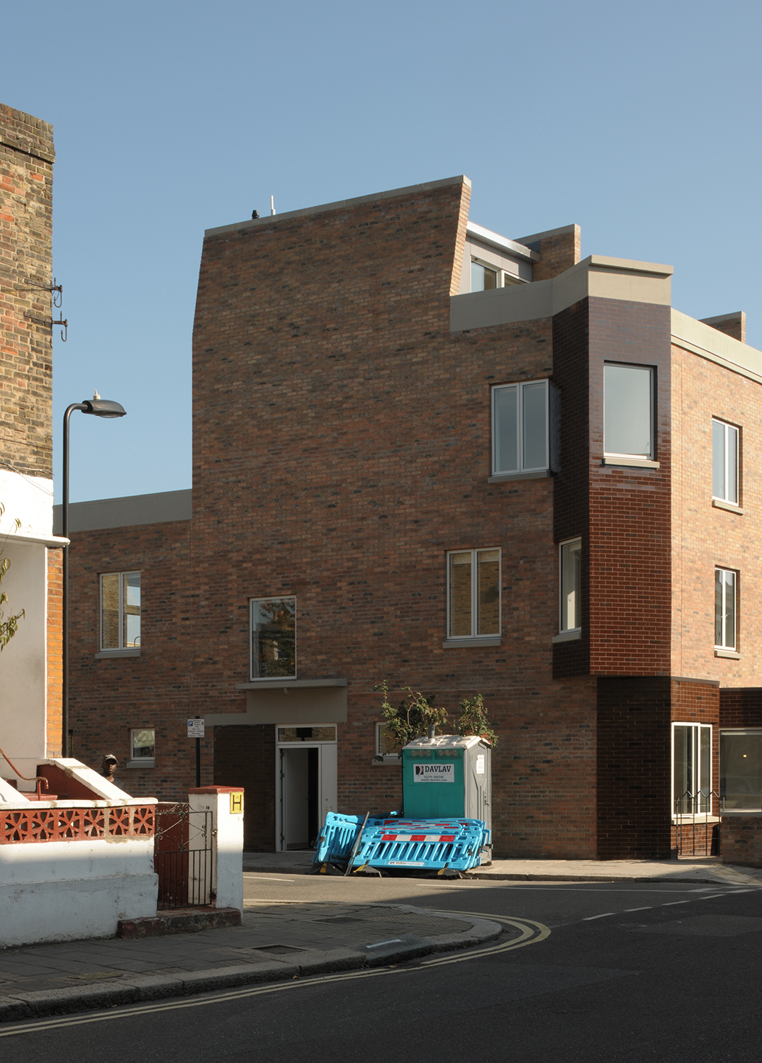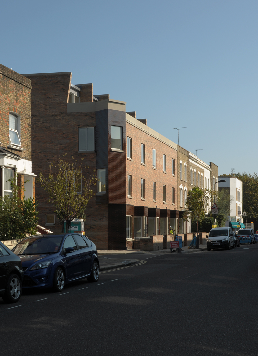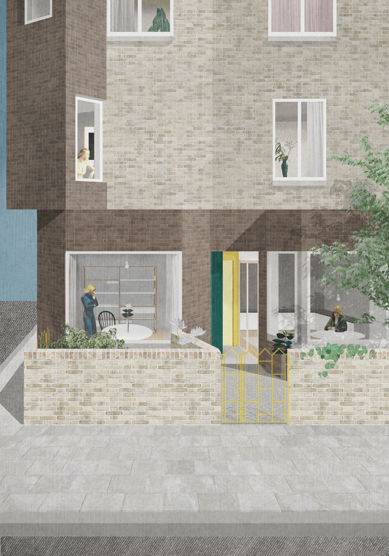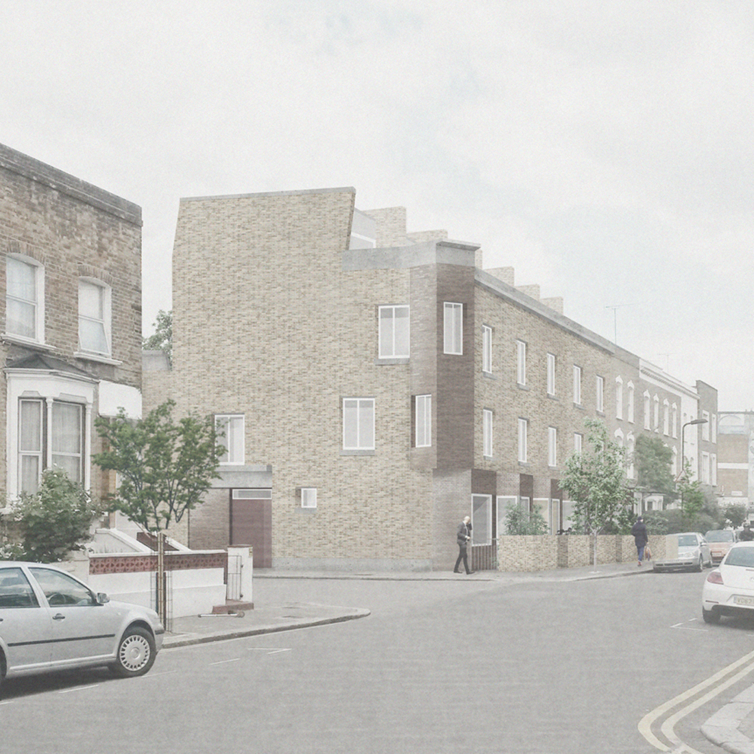 Aikin Villas est l’une des premières opération de logement social menée par la municipalité de Hackney depuis le début des années 80. Elle s’inscrit dans un ambitieux programme de construction qui prévoit la livraison directe de près de 2000 nouveaux logements entre 2018 et 2022. Le projet se situe sur un angle, entouré de maisons mitoyennes construites en briques. L’homogénéité des matériaux et les éléments répétitifs de ces maisons confèrent un caractère cohérent et familier au quartier. Partant de ce postulat, le projet respecte les principes de la maison en bande traditionnelle tout en adaptant sa morphologie et son plan pour créer un bâtiment singulier bien que familier.