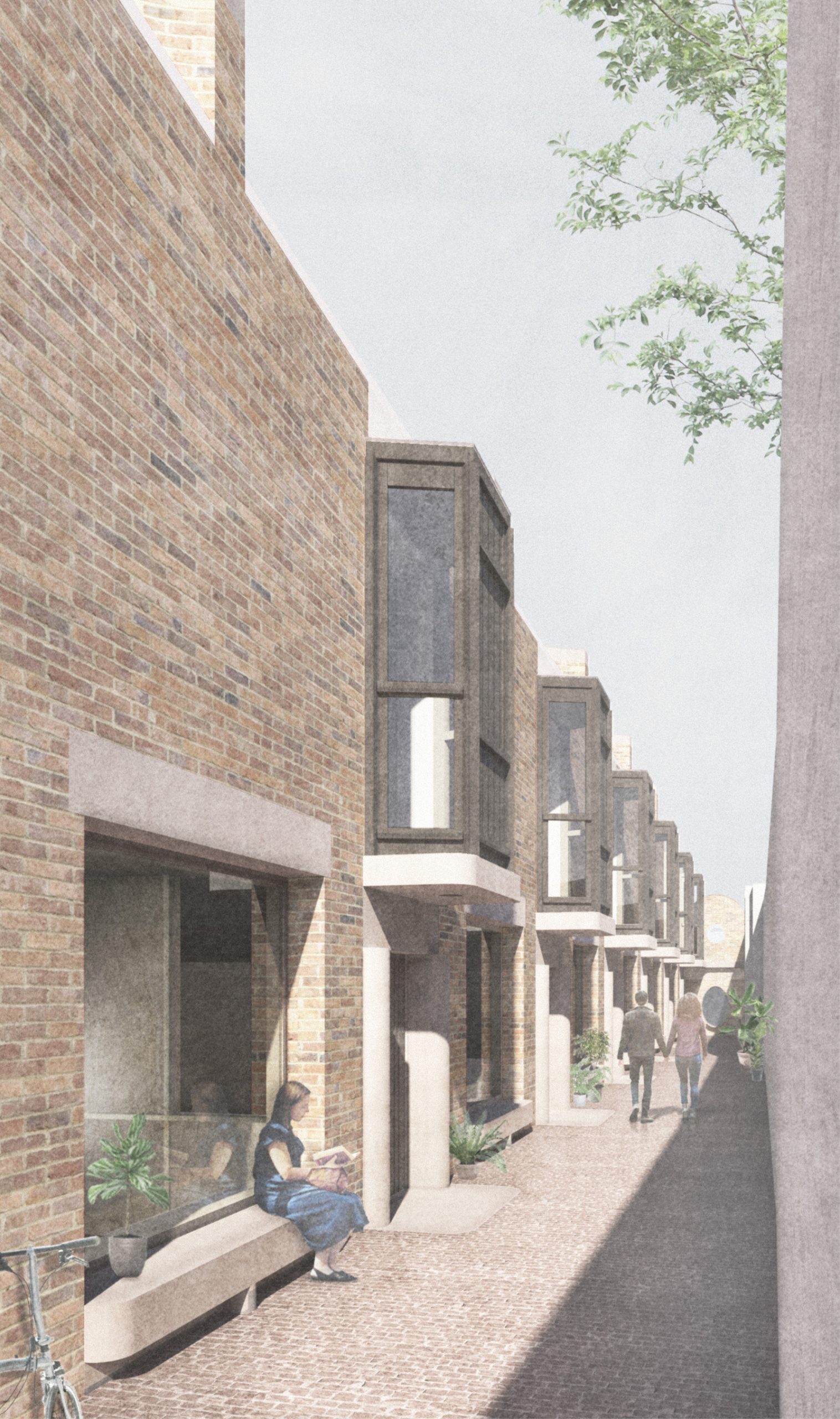 Les seuils le long des mews sont annoncés par une série de baies de bois en saillie très travaillées qui abritent chaque porte d’entrée. De grandes ouvertures vitrées rappelant les façades de magasins animent la rue, attirant la lumière naturelle vers les cuisines situées en contrebas. Des bancs intégrés favorisent les moments d’interaction entre voisins pour créer une nouvelle communauté. La disposition rythmique des éléments, des entrées, des baies, des fenêtres et des lanterneaux évoque le riche patrimoine du XIXe siècle du contexte environnant, mais aussi le passé industriel du site.