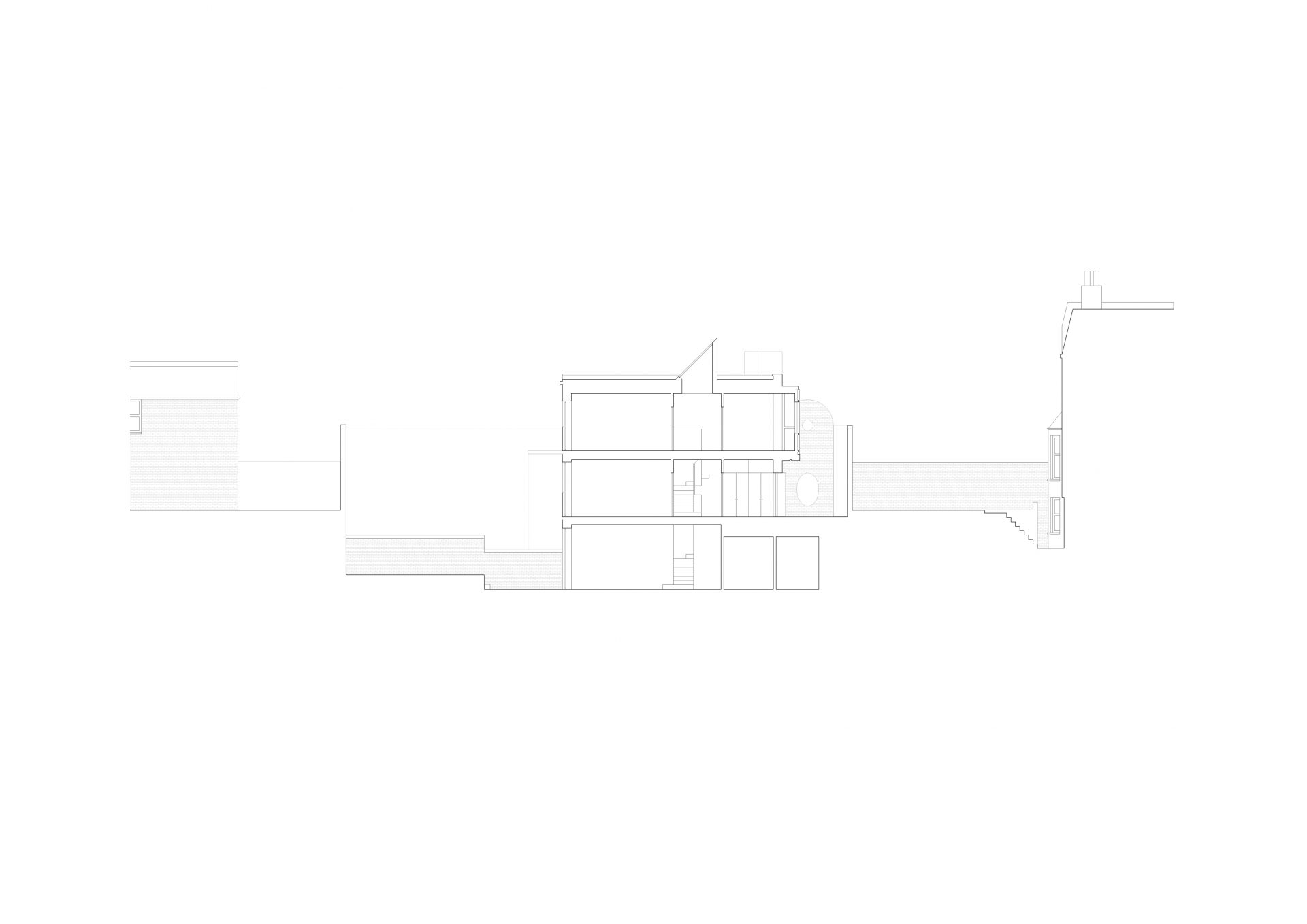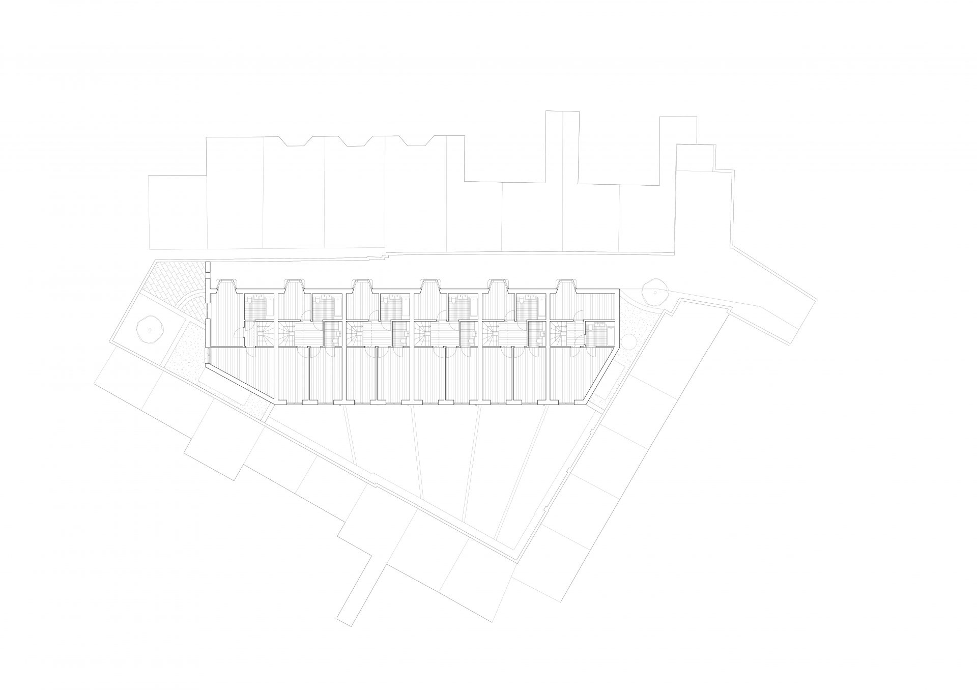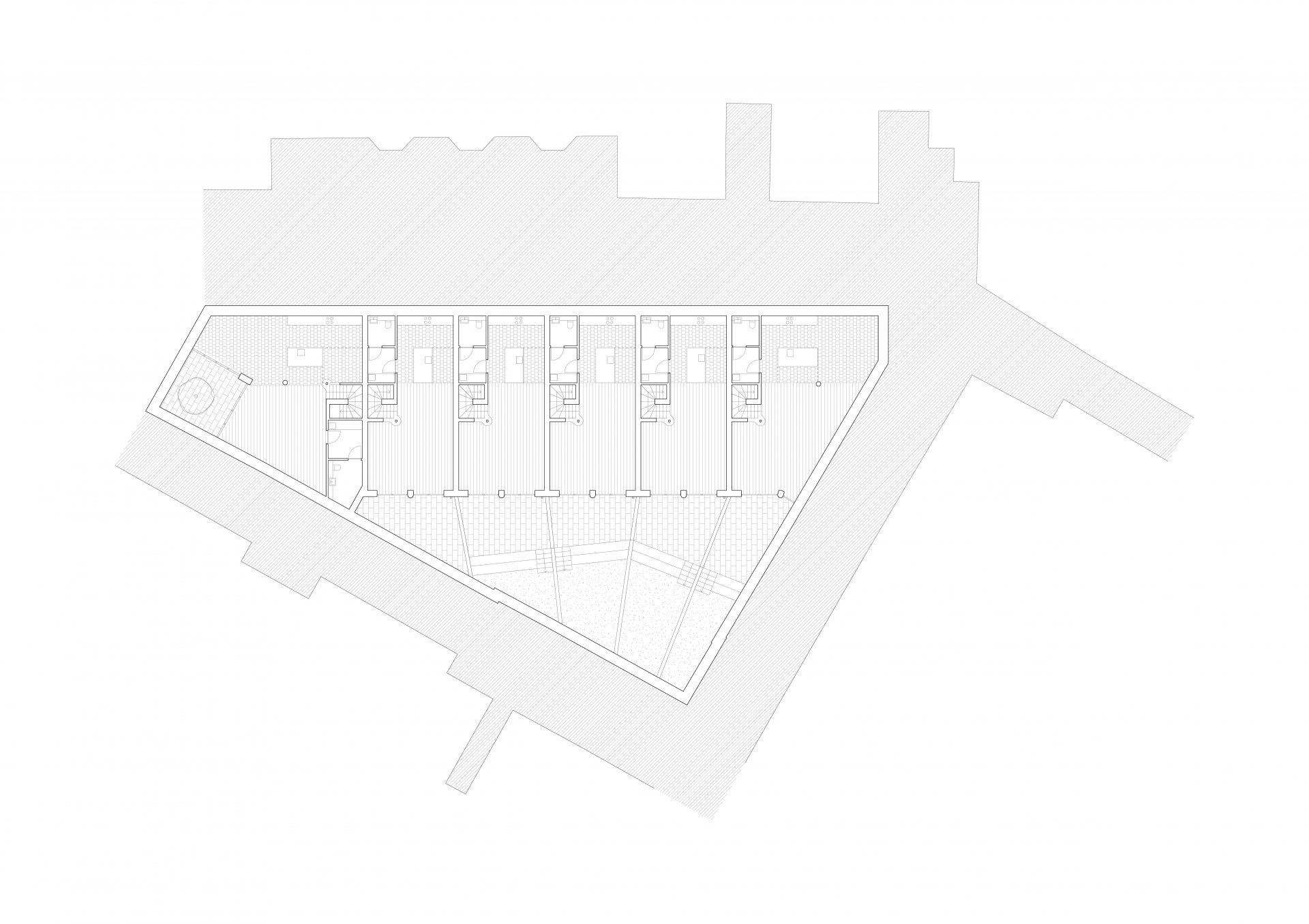 Les maisons s’inspirent des maisons mitoyennes victoriennes environnantes, mais ont été modernisées pour répondre aux exigences actuelles en matière d’espace. Les pièces ont été soigneusement proportionnées et agencées pour créer une séquence d’espaces riche et variée qui favorise des modes d’habitation flexibles. Au niveau inférieur, un salon, une cuisine et une salle à manger communicants s’étendent jusqu’au jardin privé, tandis qu’un espace de vie aux proportions plus formelles est situé au niveau de l’entrée.