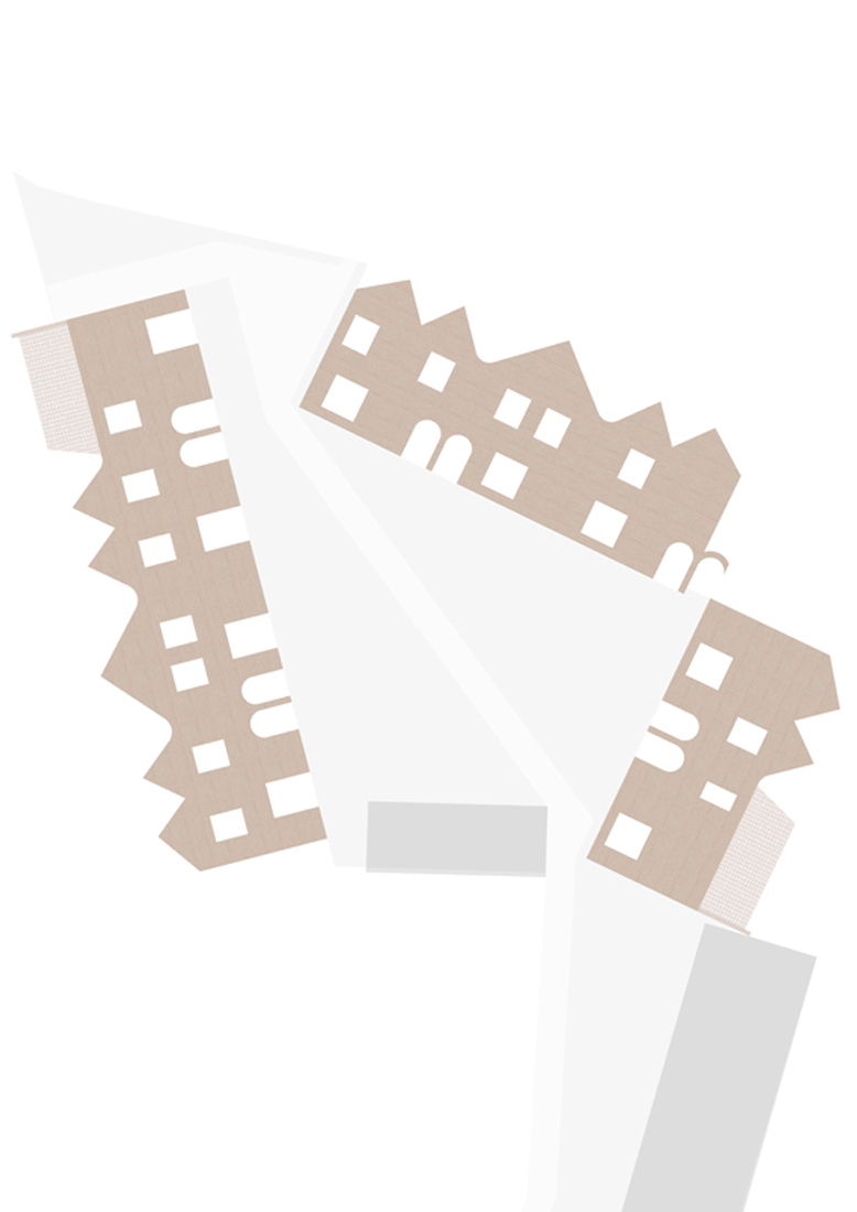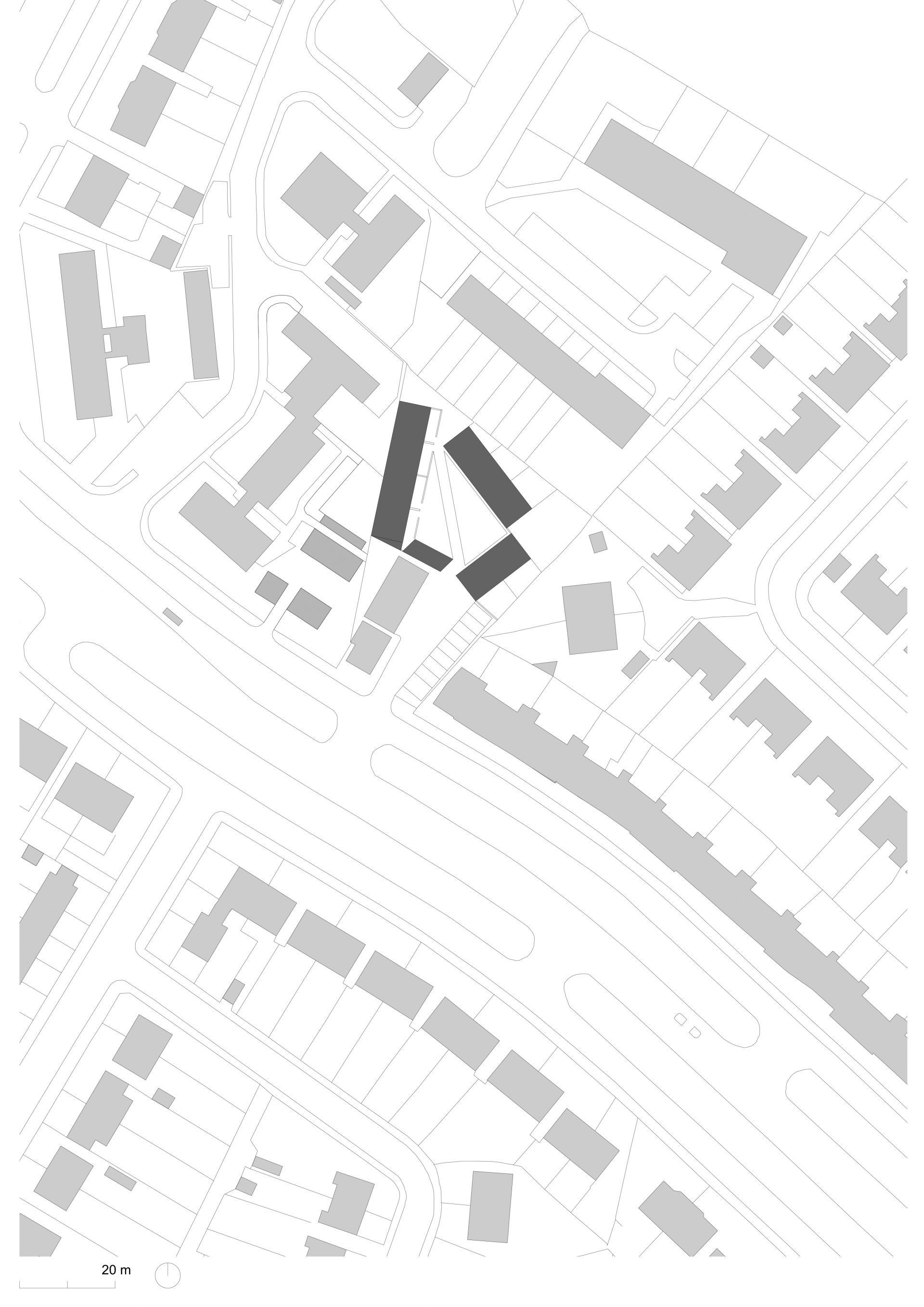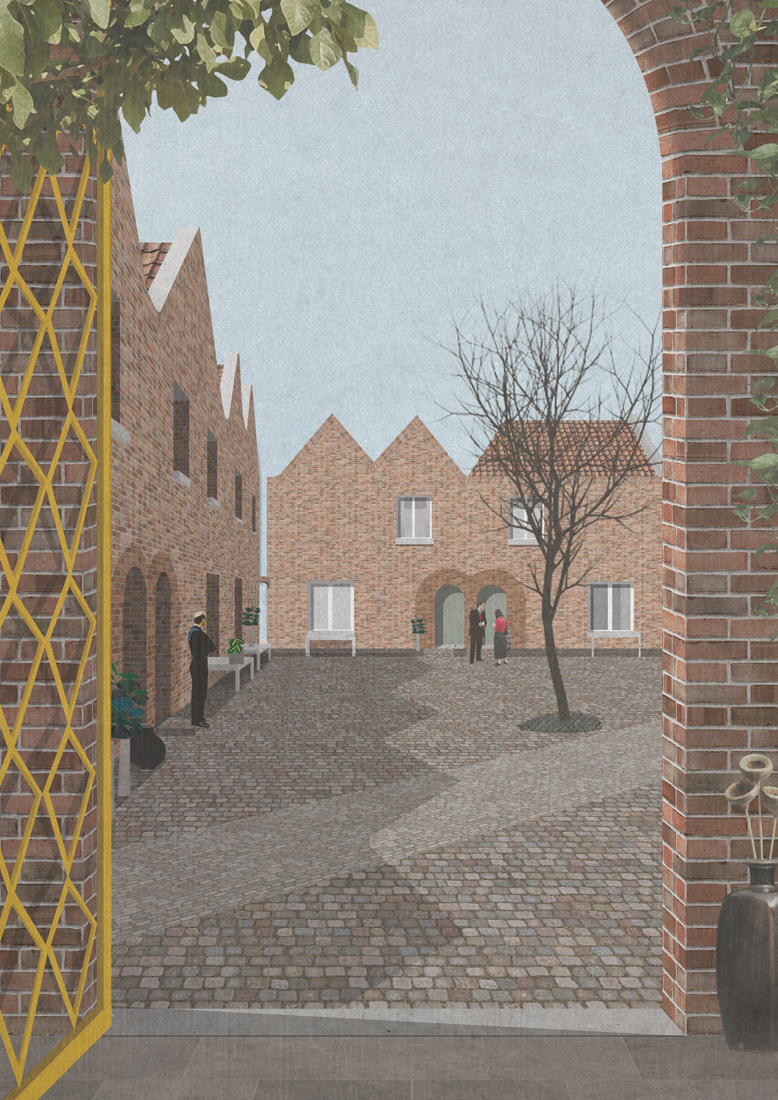 La proposition réagit à un certain nombre de contraintes, notamment la configuration irrégulière du site, la conservation/protection des arbres, les services souterrains et les droits de lumière des habitations voisines. La conception de la cour est une réponse contextuelle aux défis du site, et fait référence aux béguinages flamands.