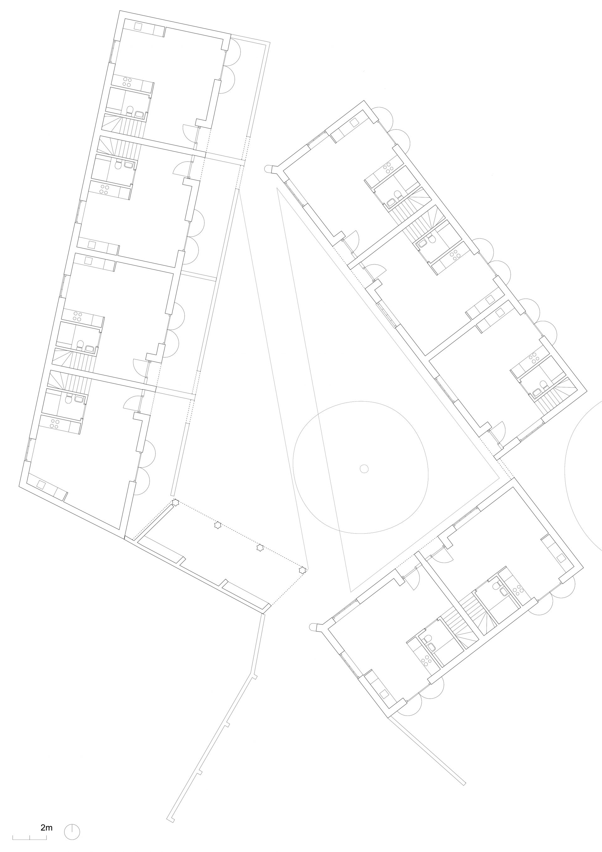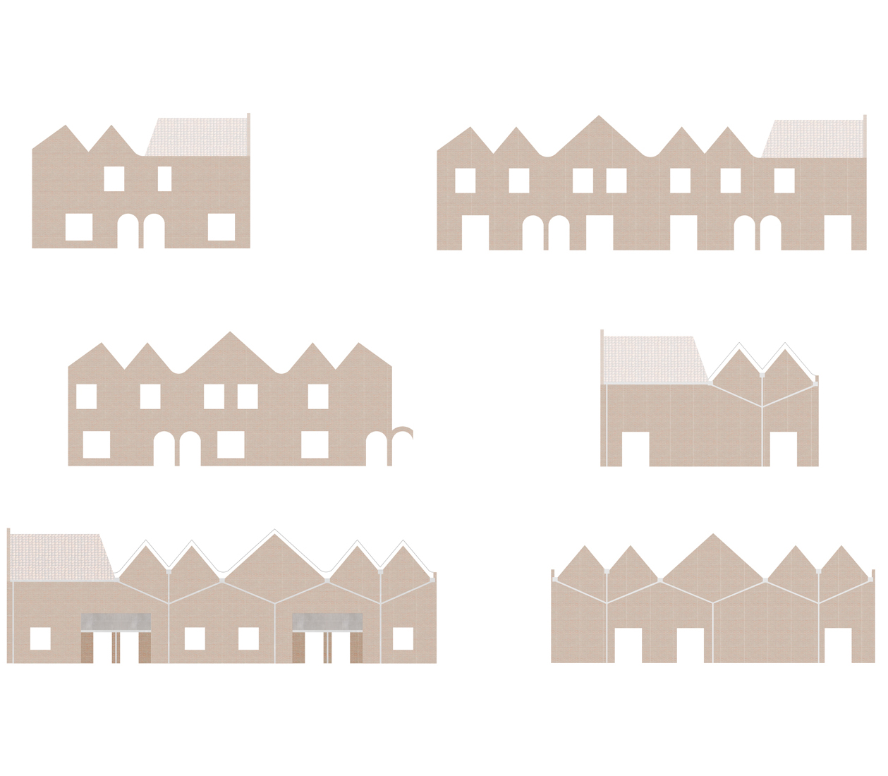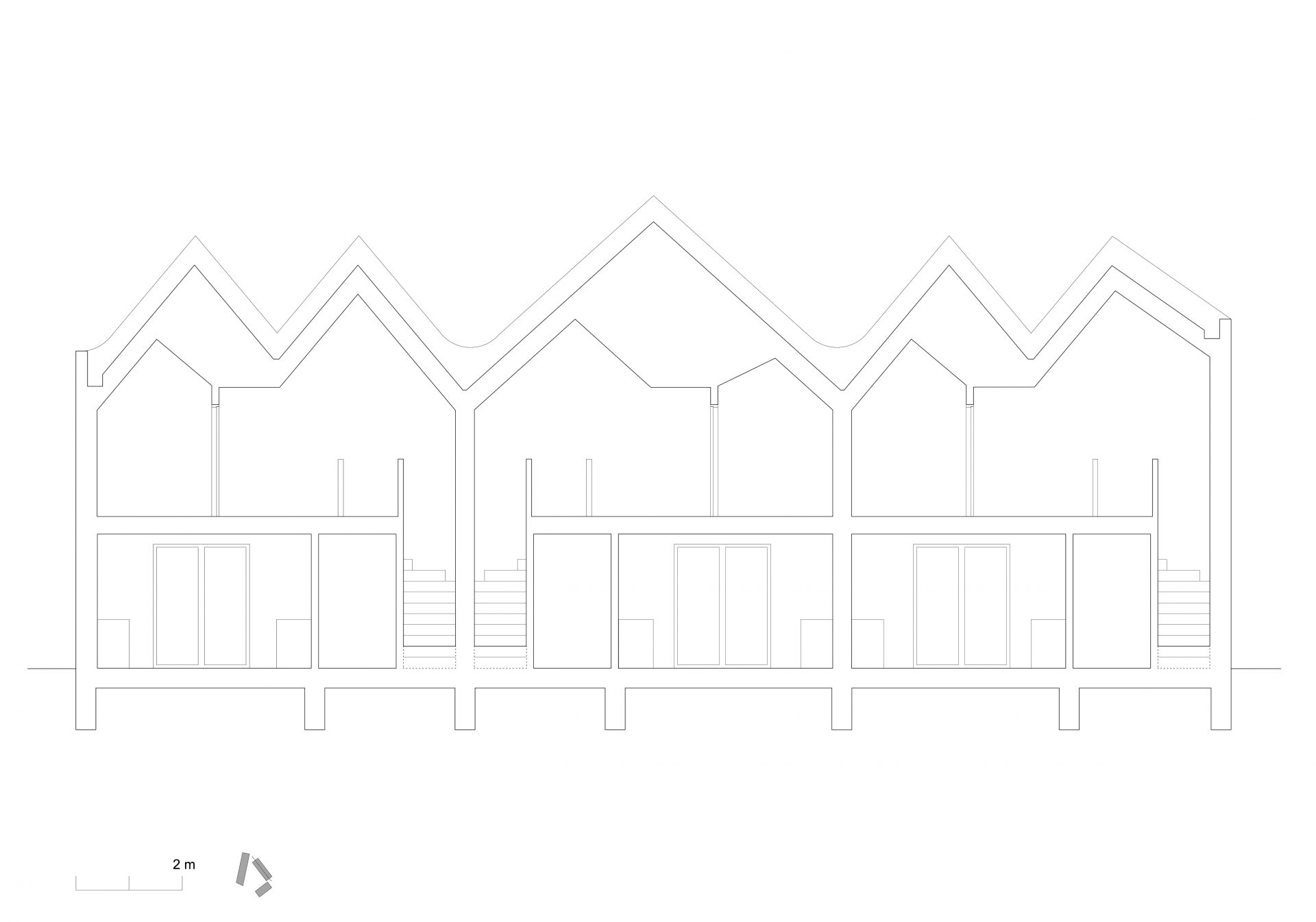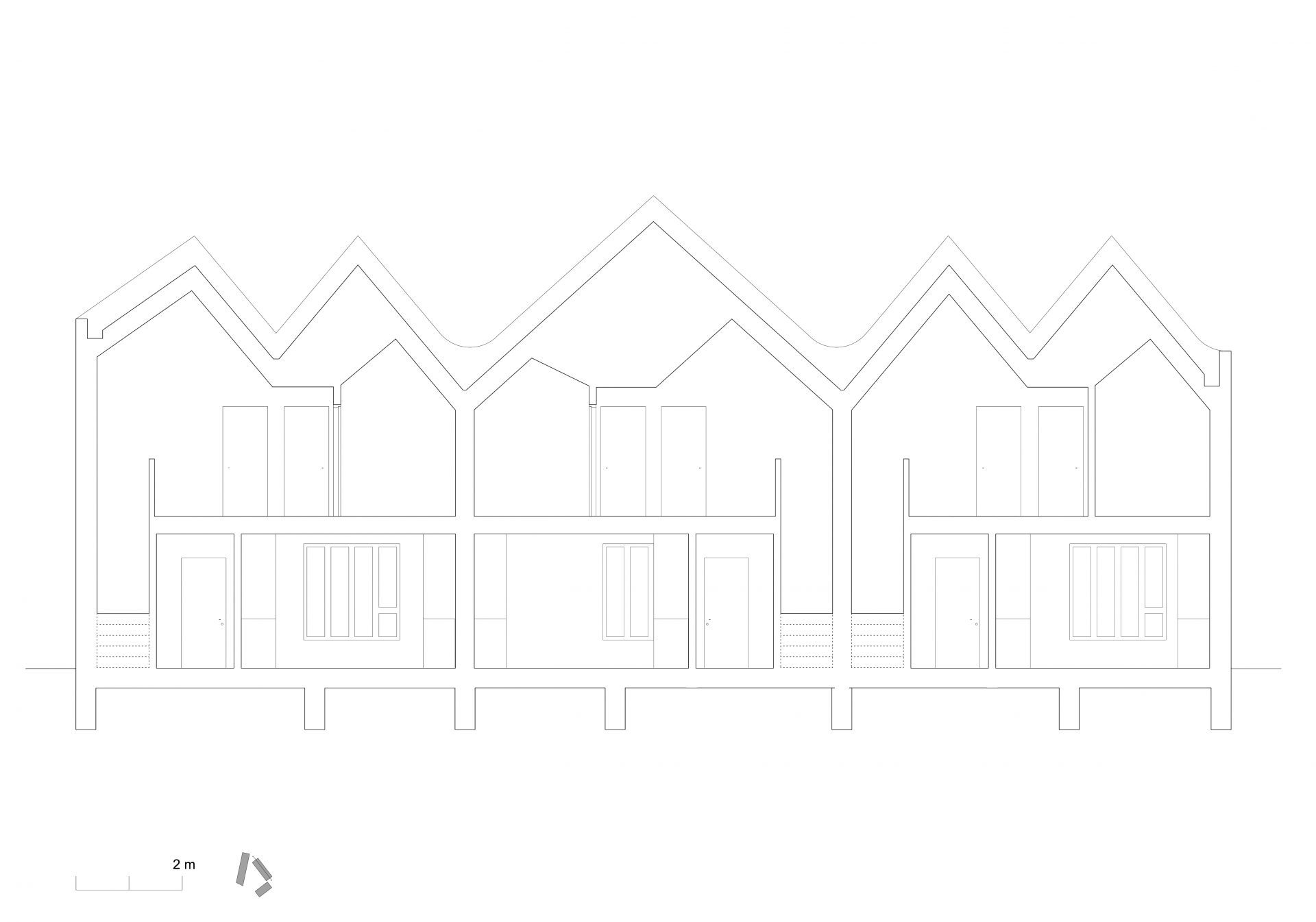 Un ensemble de maisons T3 est disposé sur le site autour d’une cour commune partagée. . Le langage conceptuel des habitations a été soigneusement développé pour donner au projet une identité cohérente, qui s’engage et renforce le caractère de son contexte. Un type de maison simple est disposé sur l’ensemble du site ; au sein de cette expression cohérente, la variation et le caractère distinctif sont trouvés en combinant les maisons de différentes manières : en rangées ou en paires en miroir, selon leur emplacement et leur contexte immédiat. Les habitations sont formées de façades robustes en brique, qui sont rehaussées par des détails en brique et des éléments en béton préfabriqué, qui marquent des moments particuliers tels que les entrées et les parapets.
