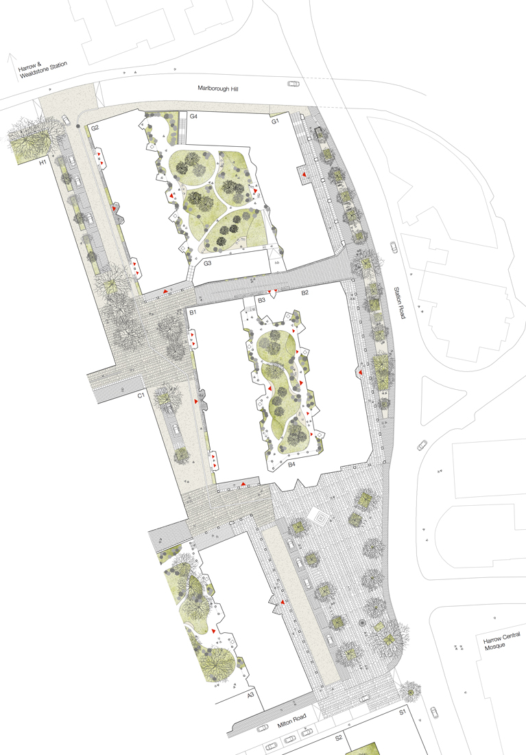 Le projet introduit sur le site une densité supérieure à celle des quartiers périurbains environnants.Le plan directeur crée un ensemble distinct, qui peut être clairement identifié et compris comme un quartier. Il marque un point de changement passionnant pour Harrow. L’un des défis de la conception du plan directeur était de savoir comment répondre à ce changement de manière pertinente. Comment introduire des densités plus élevées dans les quartiers périphériques de Londres tout en conciliant les différentes échelles et caractéristiques des quartiers ?