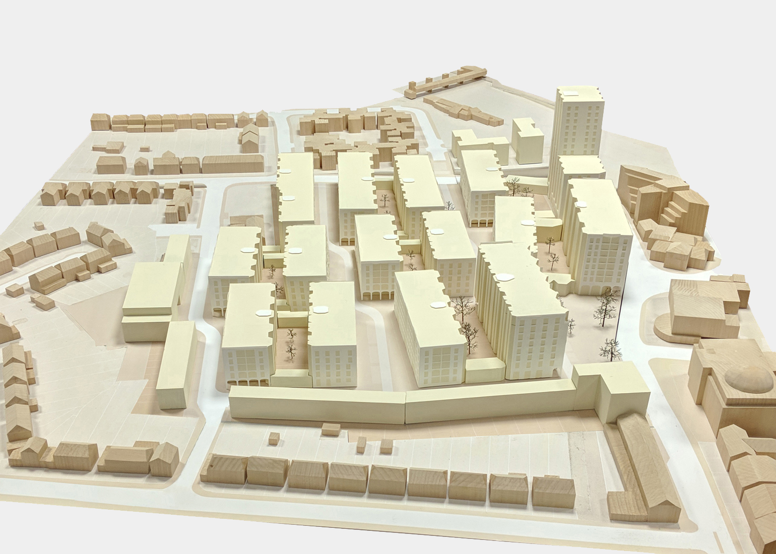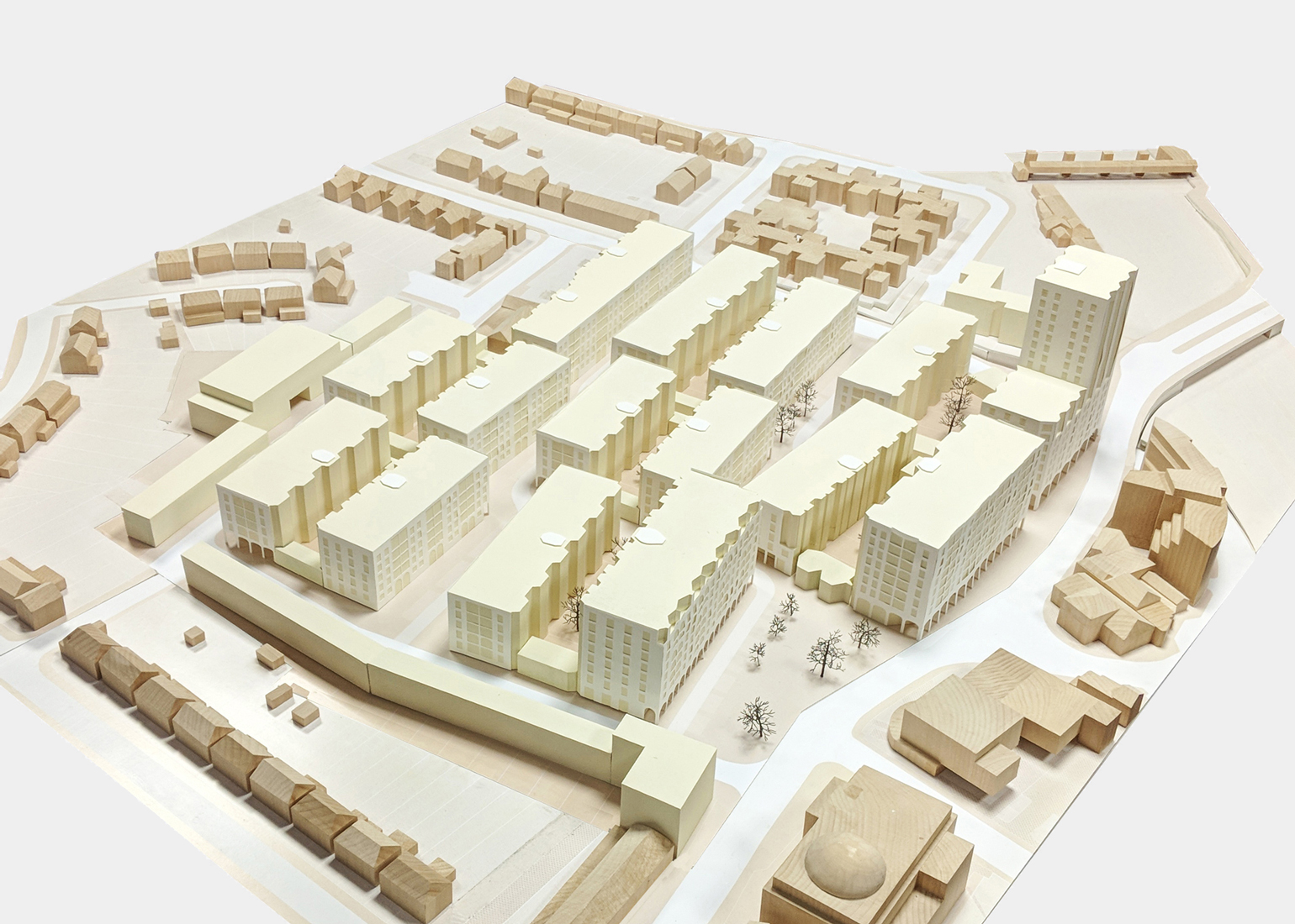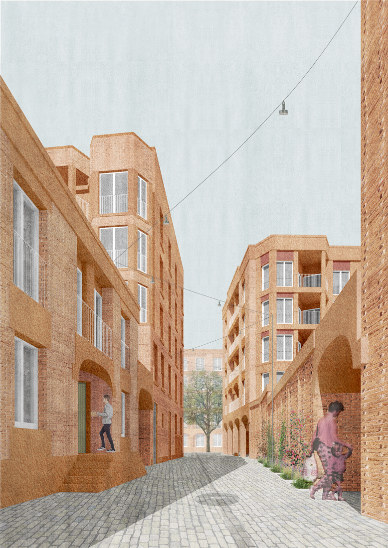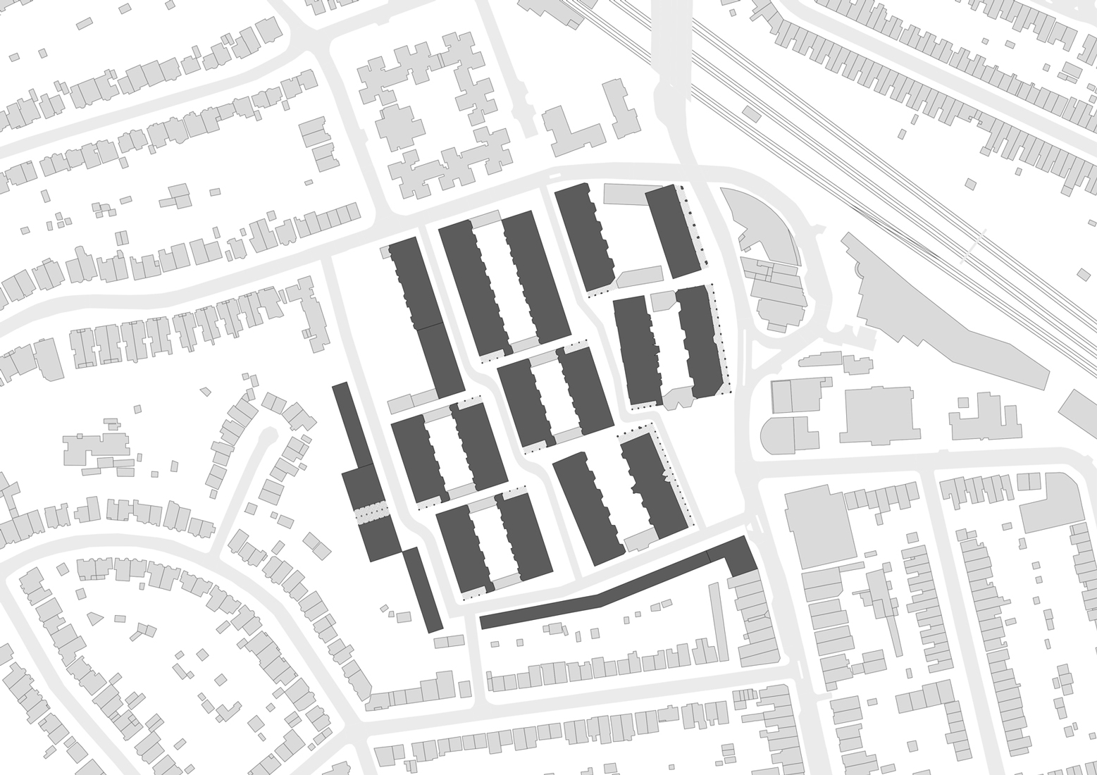 Notre approche a consisté à maintenir la clarté et à créer un nouveau quartier urbain qui soit distinct. C’est un lieu qui peut être clairement identifié et compris comme un quartier. Cet objectif est atteint en développant une cohérence dans la matérialité, dans le type de bâtiment et dans l’échelle intime des rues donnant au quartier son caractère. Ce sont surtout les rues et ruelles intimes qui donnent au quartier son caractère.