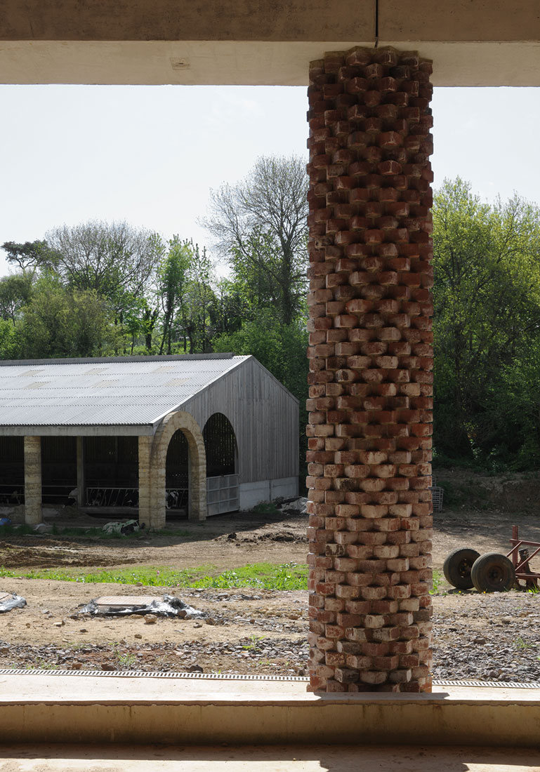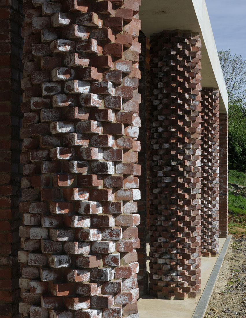 La façade à colonnade de l’étable est fabriquée en béton coulé semi-sec à partir de pierres extraites localement, reconnaissant ainsi le rôle civique joué par le bâtiment. La façade à colonnades de l’étable à foin, réalisée en briques pressées d’argile rouge, disposées selon un motif radial en dents de chien, y fait écho. Les nouveaux bâtiments s’associent à plusieurs structures existantes pour renforcer les limites de la cour de ferme et fournir des logements pour toute une série de disciplines.