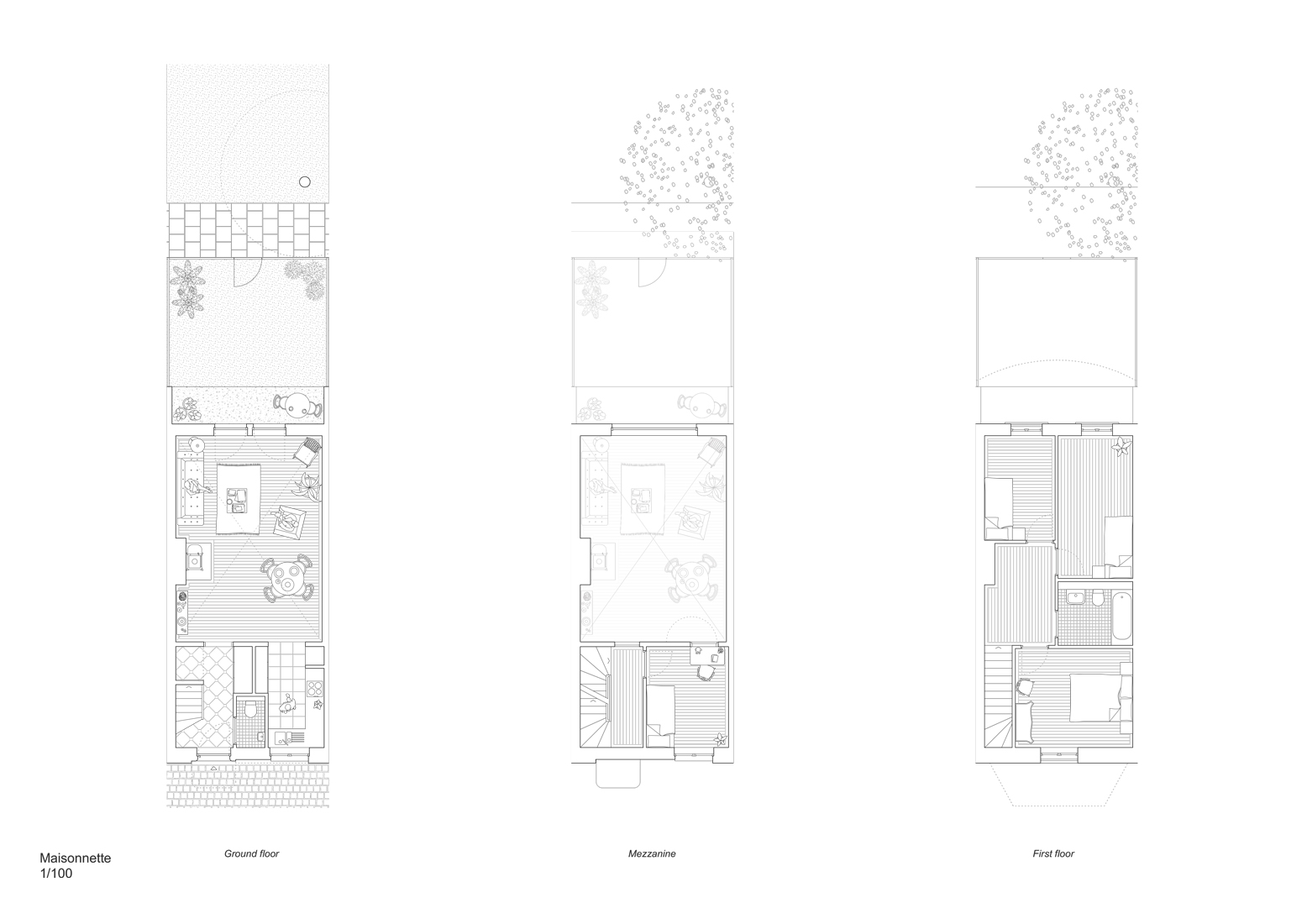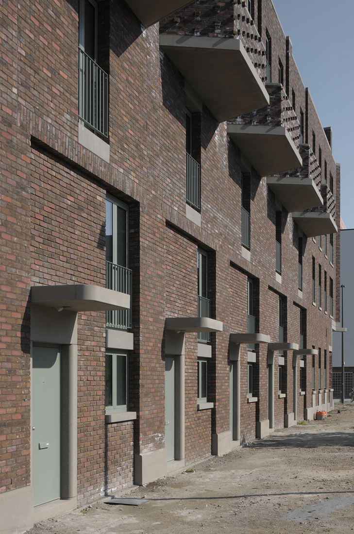 Le brief portait sur deux immeubles d’appartements en coins opposés d’un bloc urbain dans le quartier des anciens docks d’Anvers, dans le cadre de la stratégie d’urbanisme lent définie pour le redéveloppement de Het Eilandje. Le plan directeur de la zone a été initié par l’architecte municipal de l’époque, Kristiaan Borret, et conçu par Manuel de Sola – Morales. Le bâtiment est situé à la jonction de l’Indiestraat et de la Bombaystraat. Ses deux ailes sont différentes en termes d’aspect et de mélange d’unités. L’aile ouest abrite une série de maisons de trois étages avec des duplex de deux étages au-dessus, tandis que l’aile sud comprend une variété d’appartements de deux et trois chambres à coucher à double orientation.